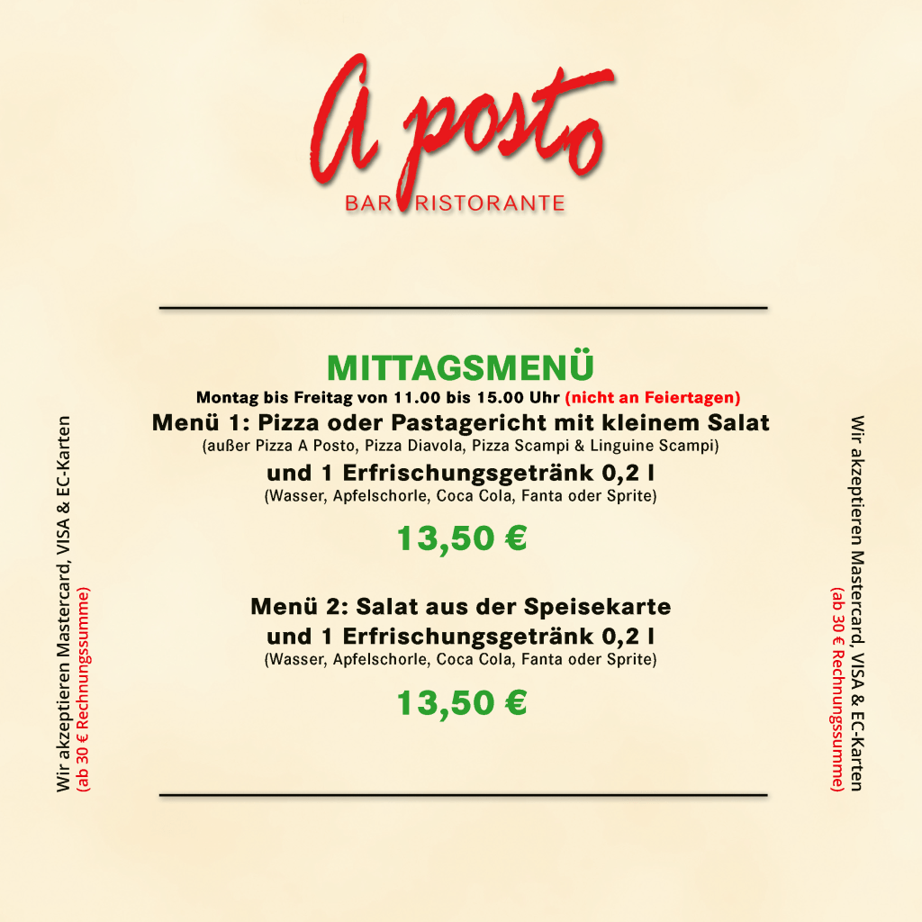Mittagsmenü – Speisekarte – Weinkarte Aposto Speisekarte AktuellHerunterladen Aposto Weinkarte AktuellHerunterladen Teilen mit: Auf X teilen (Wird in neuem Fenster geöffnet) X Auf Facebook teilen (Wird in neuem Fenster geöffnet) Facebook Gefällt mir Wird geladen …
